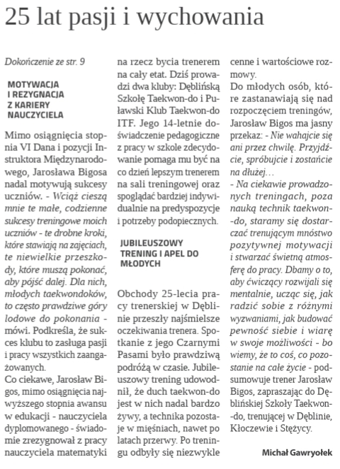 Obchody 25-lecia pracy trenerskiej w Dęblinie przeszły najśmielsze oczekiwania trenera. Spotkanie z jego Czarnymi Pasami było prawdziwą podróżą w czasie. Jubileuszowy trening udowodnił, że duch taekwon-do jest w nich nadal bardzo żywy, a technika pozostaje w mięśniach, nawet po latach przerwy. Po treningu odbyły się niezwykle cenne i wartościowe rozmowy.